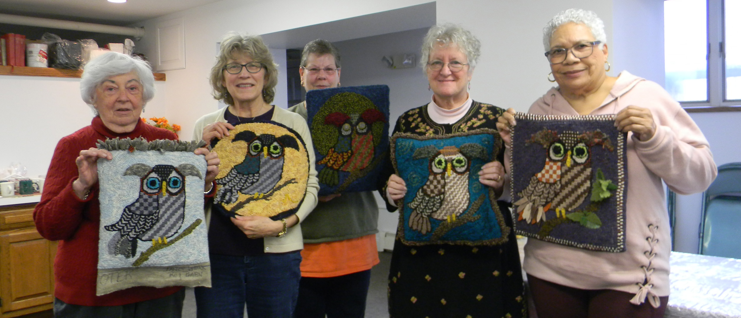 Show and Tell of our hooked owls from class in April, 2018 taught by Benita Raleigh